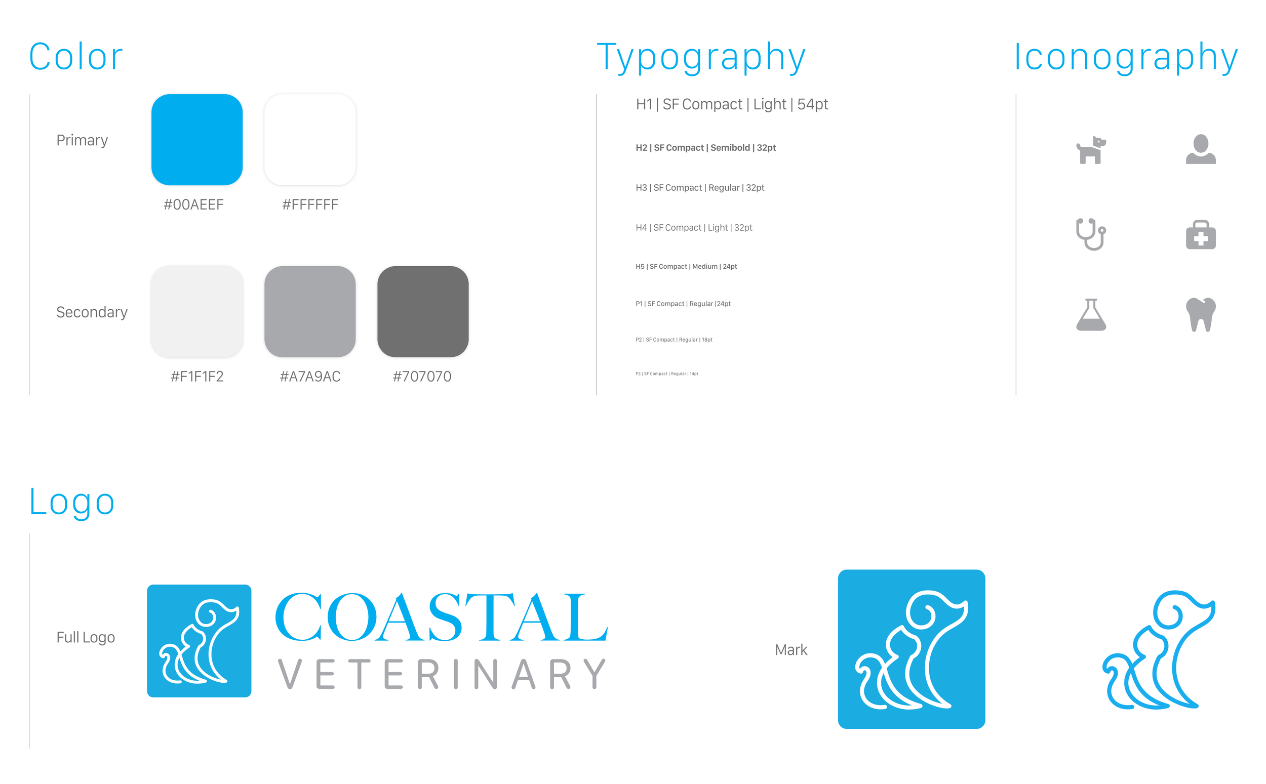 The Coastal brand uses a bright blue and white color pallet and energetic imagery of pets to give the site a lighting and airy modern feeling. The site uses the font family SF Compact for its clean lines and versatile font family.