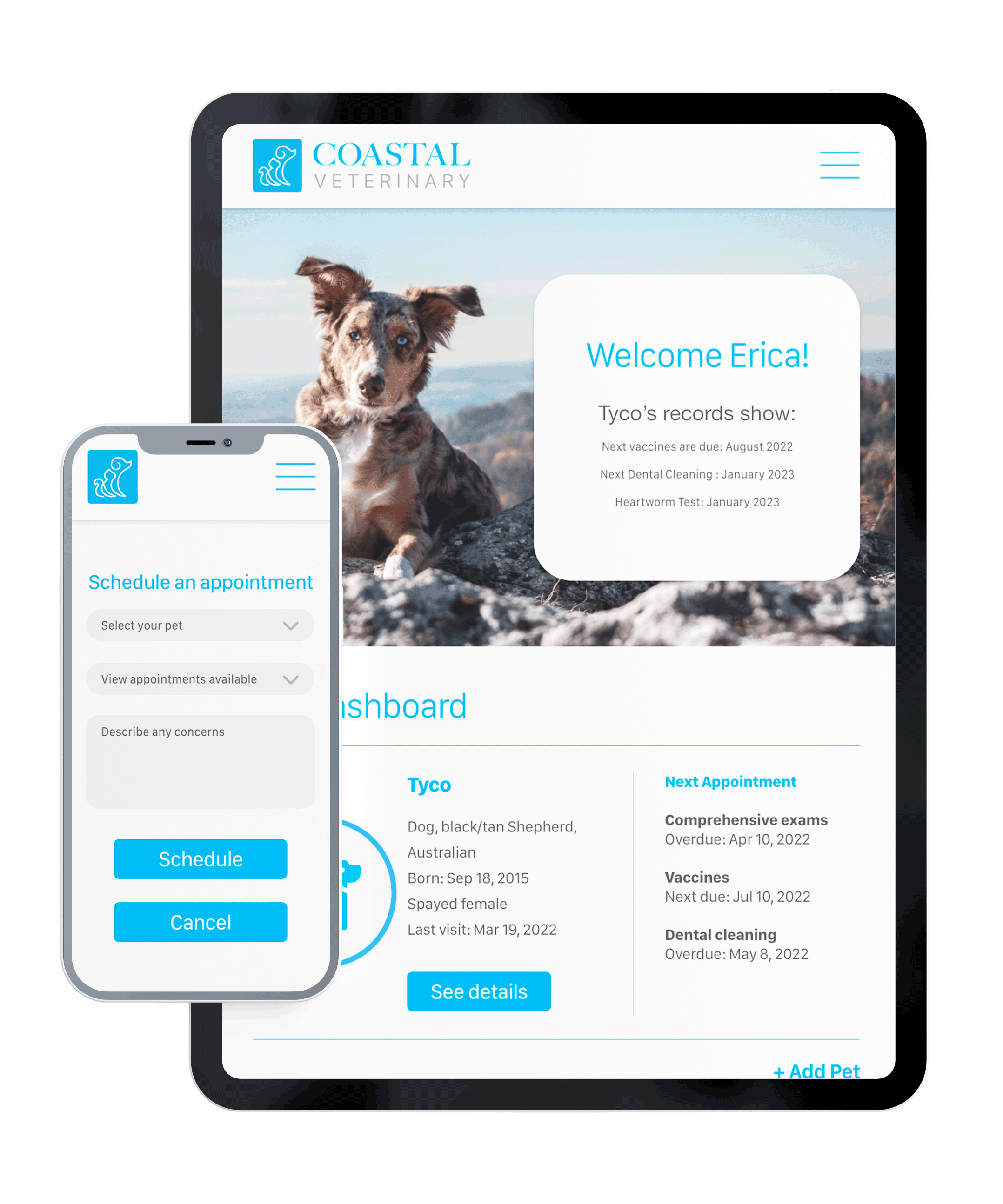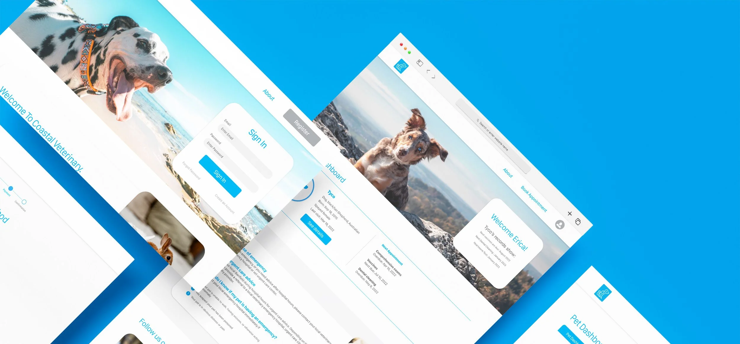 Coastal veterinary is reimagining the pet care experience by delivering a modern facility with an exceptional team of medical experts. Coastal offers a membership program to help pet owners plan their pet's healthcare and would like to provide members with a responsive online experience. This website experience allows members to check on their membership plans and payments. Also, it will enable pet owners to review their pet's records, view upcoming health care needs, and schedule appointments.
